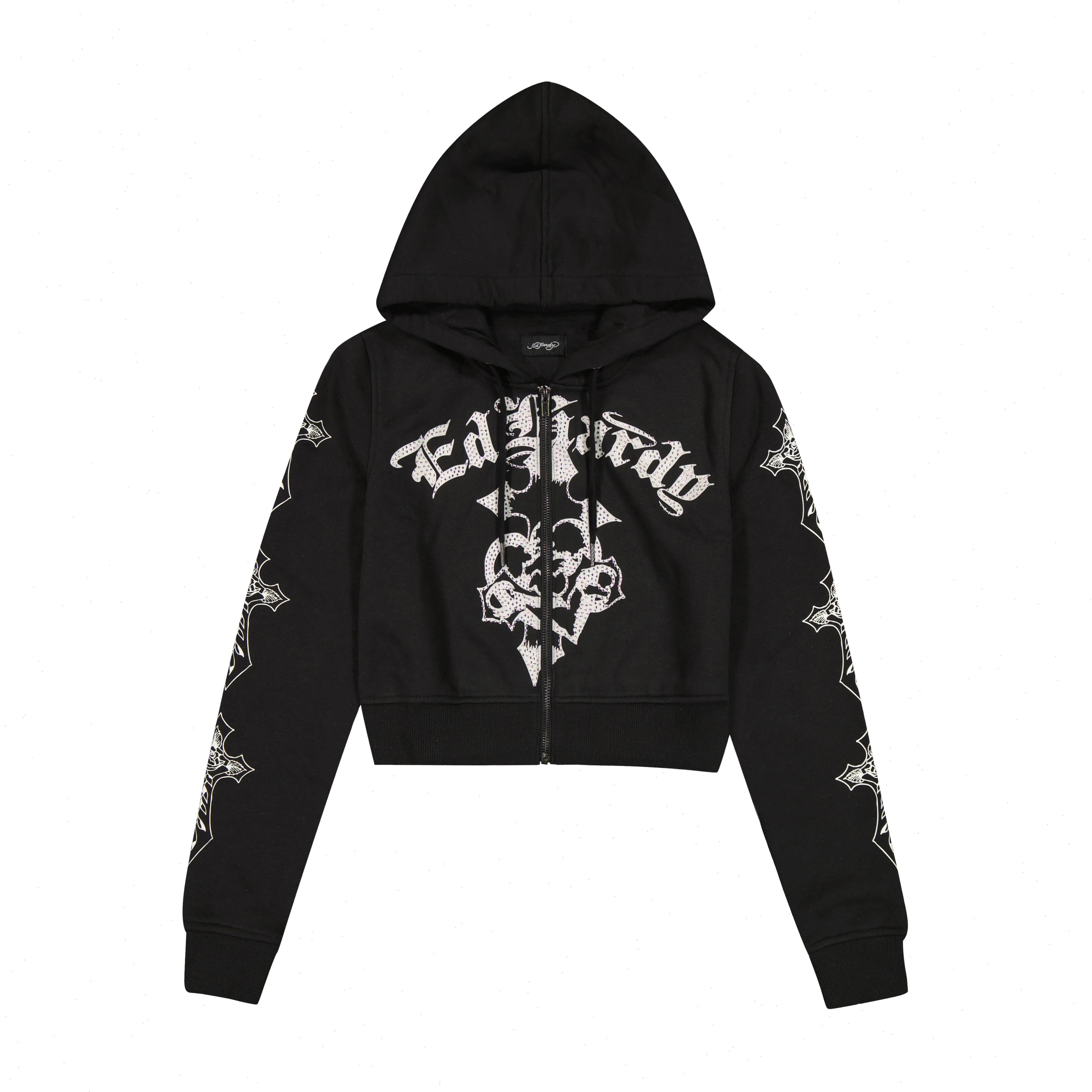 Ed Hardy’s fleece sets add a modern twist to the styles that reigned in the early 2000’s. This sweatshirt features a cropped fit and rhinestones, complete with an archival Crosses graphic.