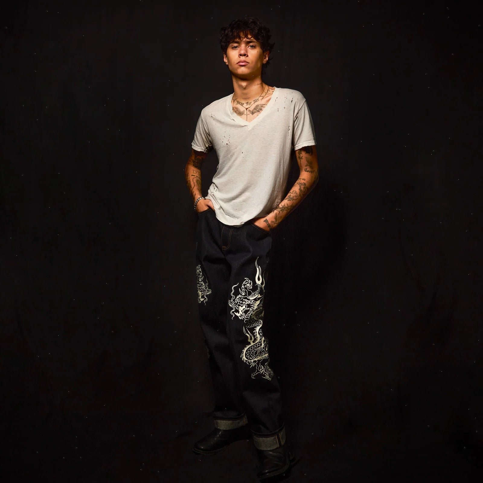 These limited edition By Appointment Only jeans are crafted from 21-ounce selvage denim in a relaxed fit. Featuring archival dragon artwork on both legs.